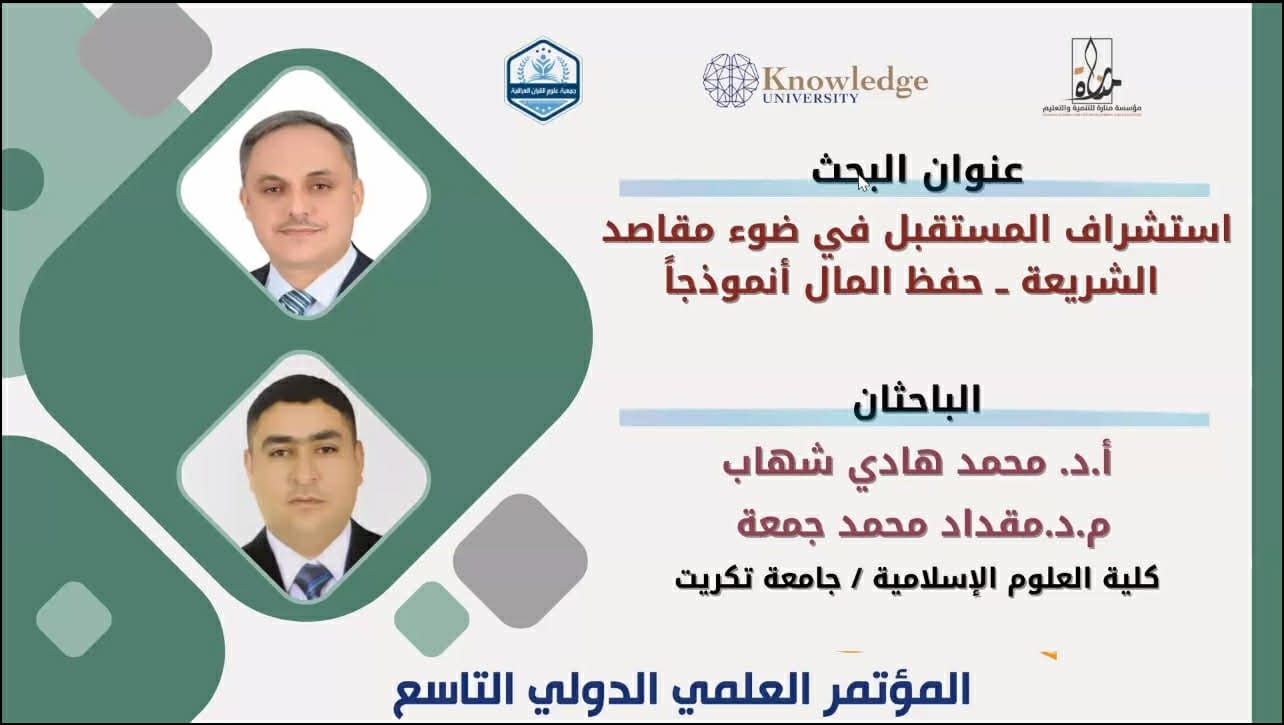 “استشراف المستقبل في ضوء مقاصد الشريعة: حفظ المال أنموذجًا”، الذي تناول فيه الباحثان دراسة منهجية لاستشراف المستقبل بالاعتماد على مقاصد الشريعة، مع التركيز على مقصد حفظ المال بوصفه نموذجًا تطبيقيًا يواكب متغيرات العصر